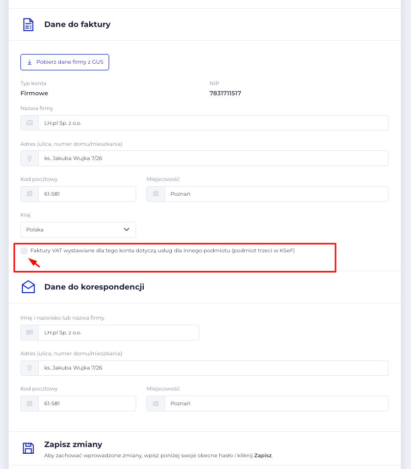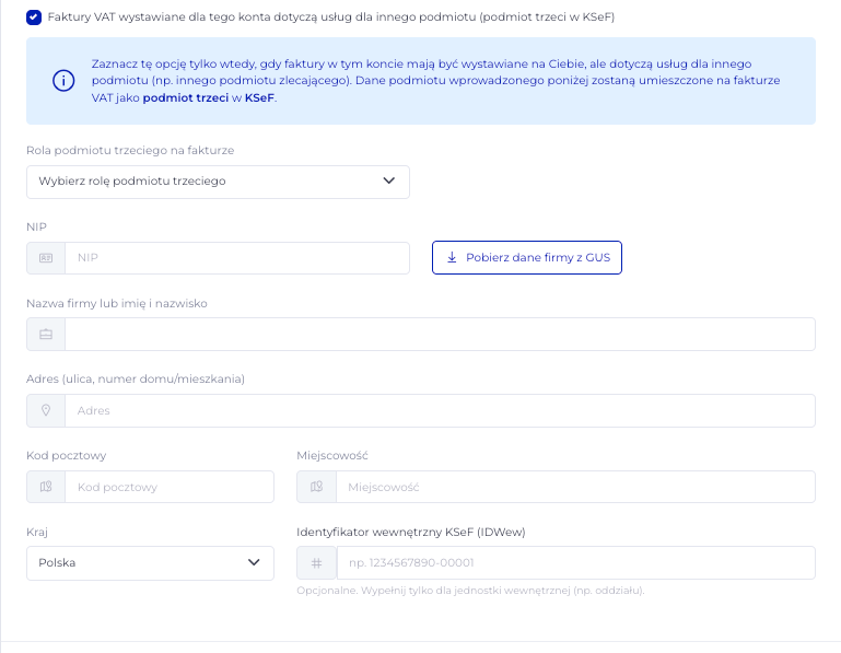 Pod sekcją Dane do faktury znajdziesz checkbox „Faktury VAT wystawiane dla tego konta dotyczą usług dla innego podmiotu (podmiot trzeci w KSeF”